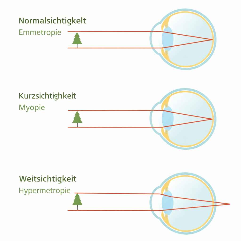 Bei Myopie ist der Augapfel meist verlängert oder die Brechkraft des Auges zu stark. Dadurch entsteht der Fokuspunkt vor der Netzhaut und entfernte Objekte erscheinen unscharf.